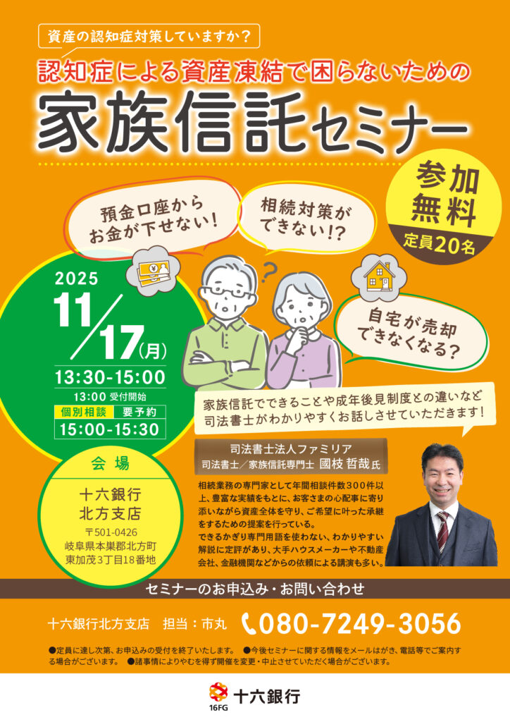 刈谷市南部生涯学習センターたんぽぽで開催される、碧海信用金庫様主催、司法書士法人ファミリア共催、刈谷市後援の「家族信託セミナー」で、ファミリアの司法書士の國枝が講師をさせていただきます。